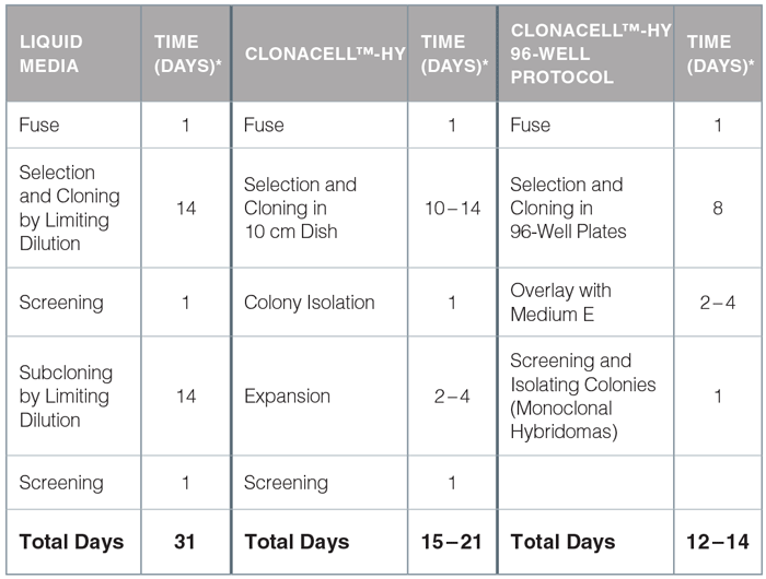 Time Comparison of Traditional, ClonaCell™-HY, and ClonaCell™-HY 96-Well Protocols for Hybridoma Generation
