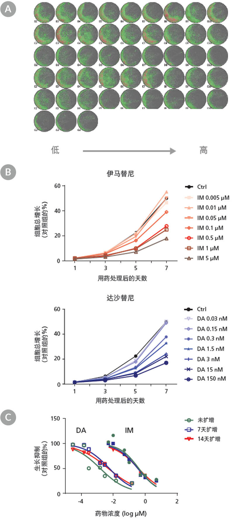 CD34+CML细胞在StemSpan™白血病细胞培养基中用伊马替尼(imatinib,IM,产 品号 #72532)和达沙替尼(dasatinib,DA,产品号 #73082)处理7天。每两天用 高分辨率成像系统对细胞进行记录以监控细胞的生长,第7天收获细胞,用流式细 胞仪计数细胞数量以测定IC 50。(A)加入IM和DA,浓度从低到高,每组3个复孔,7 天后(未扩增)细胞的代表性图像。绿色为细胞呈低浓度分布,红色为细胞呈高浓 度分布。(B)加入IM和DA之后,使用成像系统及其细胞密度算法,每两天对细胞进 行一次成像分析,生成的(未扩增)细胞生长曲线。(C)使用流式细胞仪在加药7天 后分析7-AAD -细胞所得的数据,生成未扩增,7天扩增,14天扩增细胞的剂量反应 曲线(Dose-response curves)。用药组细胞数量根据对照组的细胞数量做了标准 化处理。IM和DA对CD34 +CML细胞的抑制效果与用药浓度和培养时间相关。扩增/ 未扩增的 +CML细胞都能够生成剂量反应曲线来测定IC 50。IM和DA的IC50分 别为4.1 nM与0.37 μM。注:7天扩增,14天扩增的CML细胞都带有BCR-ABL基因, 由单集落qPCR(single colony qPCR)验证发现与未扩增CML细胞的BCR-ABL丰度 (frequency)相似( 参考文档号 #27105)。