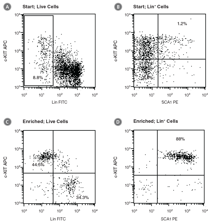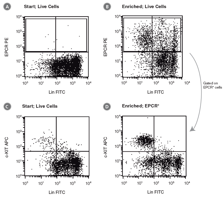 If accurate measurement of EPCR expression on the enriched cells is desired, a PE-conjugated anti-EPCR antibody should be used for cell selection. The PE-labeled EPCR+ cells will be available for flow cytometric analysis immediately after cell separation. The expression of other cell surface proteins can be further analyzed by using appropriately conjugated antibodies (e.g. anti-Lin FITC, anti-SCA1 APC and anti-c-KIT PE-Cy5 for LSK cells).