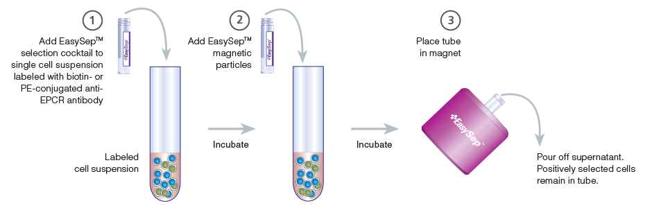 EPCR+ cells are targeted with anti-EPCR antibodies and are then crosslinked to magnetic particles. The sample is placed in the EasySep™ Magnet, and the magnetically labeled EPCR+ cells remain in the tube when the supernatant is removed. The EPCR+ cells are easily collected by removing the tube from the magnet.