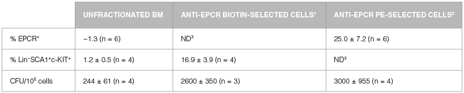 Table 2. Enrichment of Hematopoietic Cells by EasySep™ Positive Selection of EPCR+ Cells Using Biotinylated or PE-Conjugated Anti-EPCR Antibodies