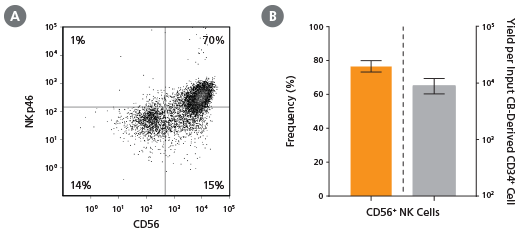 The protocol described in this technical bulletin can be used to generate CD56+ NK cells after 28 days of culture of CB-derived CD34+ cells. The differentiated cells can be stained with antibodies directed against cell surface markers CD56, NKp46, NKp44, NKp30, NKG2D, CD94, CD16, and KIR and analysed using flow cytometry (see Figures 2A and 3 for representative flow cytometry plots). Shown below are flow cytometry plots, yields, and frequencies generated using the protocol. In addition to cell surface marker expression, the average frequency and yield of CD56+ NK cells generated in culture are shown (Figure 2B).