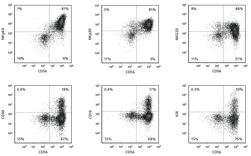 CB-derived CD34+ cells were cultured with the StemSpan™ NK Cell Generation Kit for 28 days. The differentiated cells were harvested and analysed by flow cytometry for the expression of CD56, NKp44, NKp30, NKG2D, CD94, CD16, and KIR. Staining for KIR molecules was performed using a combination of two clones for the antibody, 180704 and HP-MA4, as each recognizes a distinct subset of KIR molecules.
