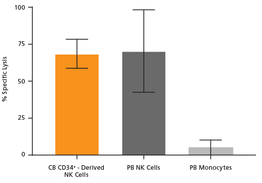 NK cells were generated from CB-derived CD34+ cells over 28 days using the protocol in Figure 1. On day 28, cells were harvested, stained for CD56, and viable CD56+ cells were counted. K562 cells were incubated with 8 μM calcein AM at 37°C for 1 hour and then washed twice. CD56+ NK cells were then combined with 10,000 of these calcein AM-labeled K562 target cells at an Effector:Target ratio of 5:1 in U-bottom 96-well plates and co-cultured at 37°C for 4 hours. Adult peripheral blood (PB) NK cells and monocytes isolated using EasySep™ were used as positive and negative controls, respectively. PB NK cells were cultured overnight with the NK Cell Differentiation Supplement and SFEM II, while PB monocytes were cultured overnight in SFEM II only. To detect spontaneous release, control wells containing only calcein AM-labeled K562 target cells were set up. The labeled K562 cells were treated with 1% Triton™ X-100 to measure maximum release. After incubation, plates were centrifuged at 500 x g for 5 minutes and 100 μL of supernatant was transferred to black plates and analyzed using a SpectraMax® microplate reader (excitation 485 nm/emission 530 nm). Results are expressed as % specific lysis: [(test release - spontaneous release) x 100] / (maximum release - spontaneous release). CB CD34+-derived NK cells show similar killing activity toward K562 target cells compared to PB NK cells. Shown are means ± SD (CB CD34+-derived NK cells: n = 18, PB NK cells and monocytes: n = 7).