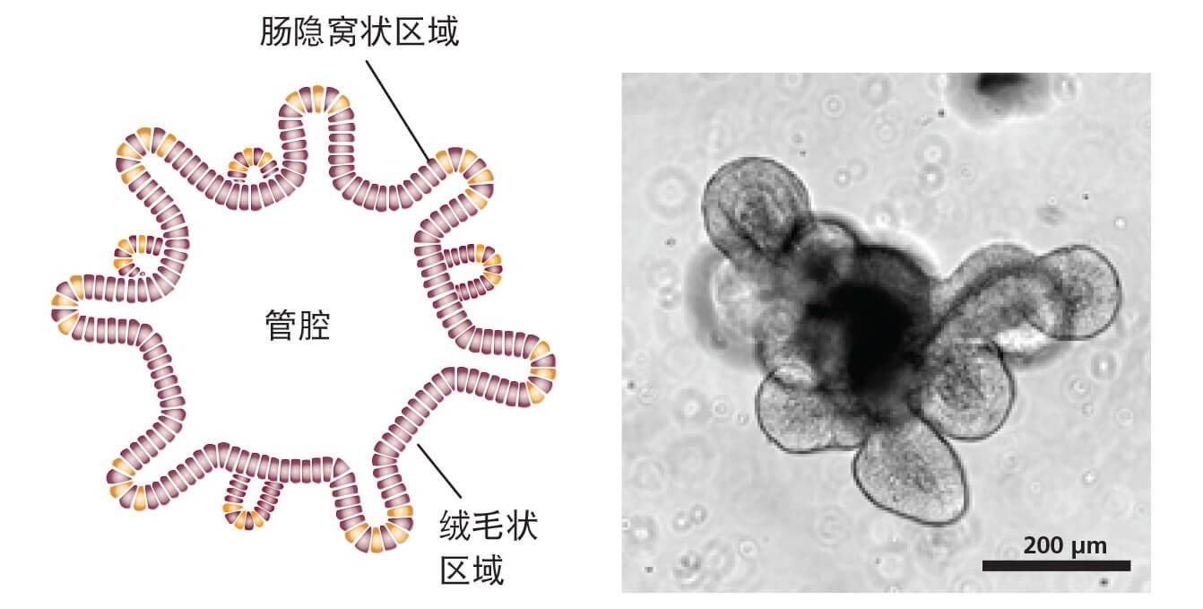 成熟的肠类器官的示意图(左)和成熟小鼠肠类器官(第5天)的明视图像(右)。中心腔由单层上皮和“萌芽”的隐窝状区域所围绕。
