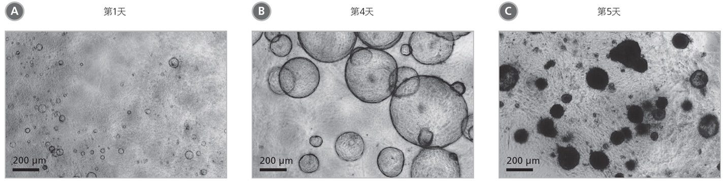 原代培养体系(p0)建构的类器官,每4-7天即可进行传代,经一次传代后(p1+),一般3-5天需要进行一次传代。传代的最佳时间为类器官内腔开始变暗,不同的培养体系传代时间可能会有所差别,也会因接种的起始密度和组织来源而不同。如果大部分的类器官中心腔清晰、小于100 μm,则将培养物放回培养箱中再培养一天。