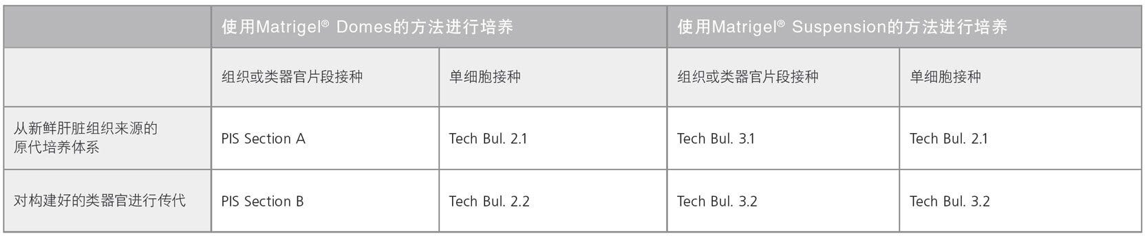 下表概述了在HepatiCult™类器官生长培养基(小鼠)中培养肝祖细胞类器官的可用方案,以及对应的详细方案。在此表中,Tech Bul. 请参阅本文档(DX27087),而PIS请参见产品说明书(DX21821)。
