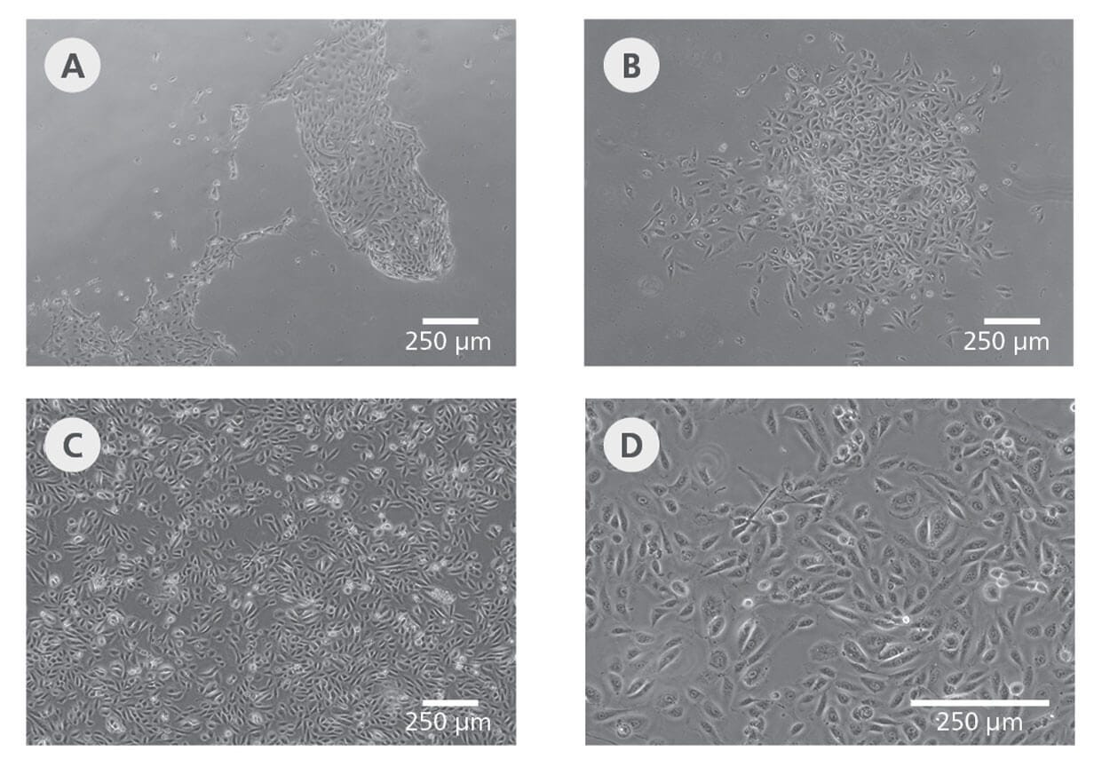 - 每2-3天完全更换一次UDCI培养基。正常情况下,细胞集落将 在第10天左右出现。有关建立UDC培养物的示例图,请参见图 1A-B。
