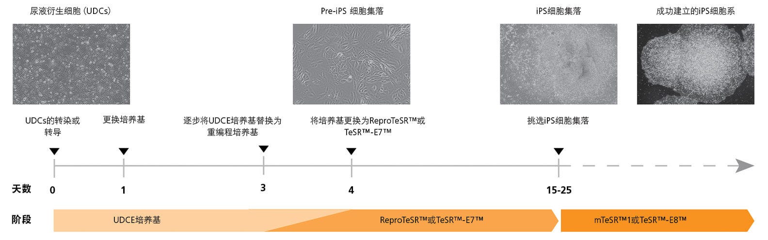 第0天,使用游离性载体对UDCs使进行转染,并在UDCE培养基中培养。转染后第24小时,需要更换新鲜的UDCE培养基。转染3天后,将培养基换为重编程培养基(ReproTeSR™ 或TeSR™-E7™)和UDCE培养基的1:1混合物。从转染后第4天开始,仅使用重编程培养基(ReproTeSR™ or TeSR™-E7™)进行余下的实验流程,直到iPS细胞集落出现。通常20 天左右可以看到足够大的细胞集落,将iPS细胞分离并在mTeSR™1或TeSR™-E8™中扩增。
