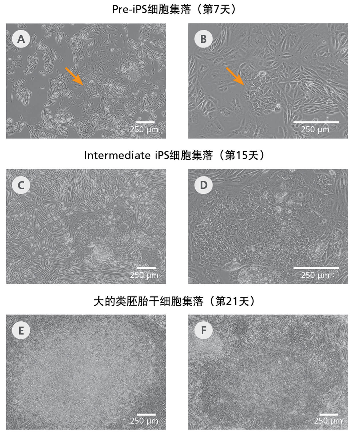 (A-B)诱导后1-2周将出现具有Pre-iPS细胞形态的集落小团(见箭头)。(C-D)这些 小团在2-3周左右将会扩展为intermediate iPS细胞集落。(E-F)在3-4周左右可以清 楚地识别出较大的类ES细胞集落。用含有OCT4,SOX2,KLF4,LIN-28和L-MYC的游 离性载体对人UDCs重编程之后得到的iPS细胞集落代表性图像。