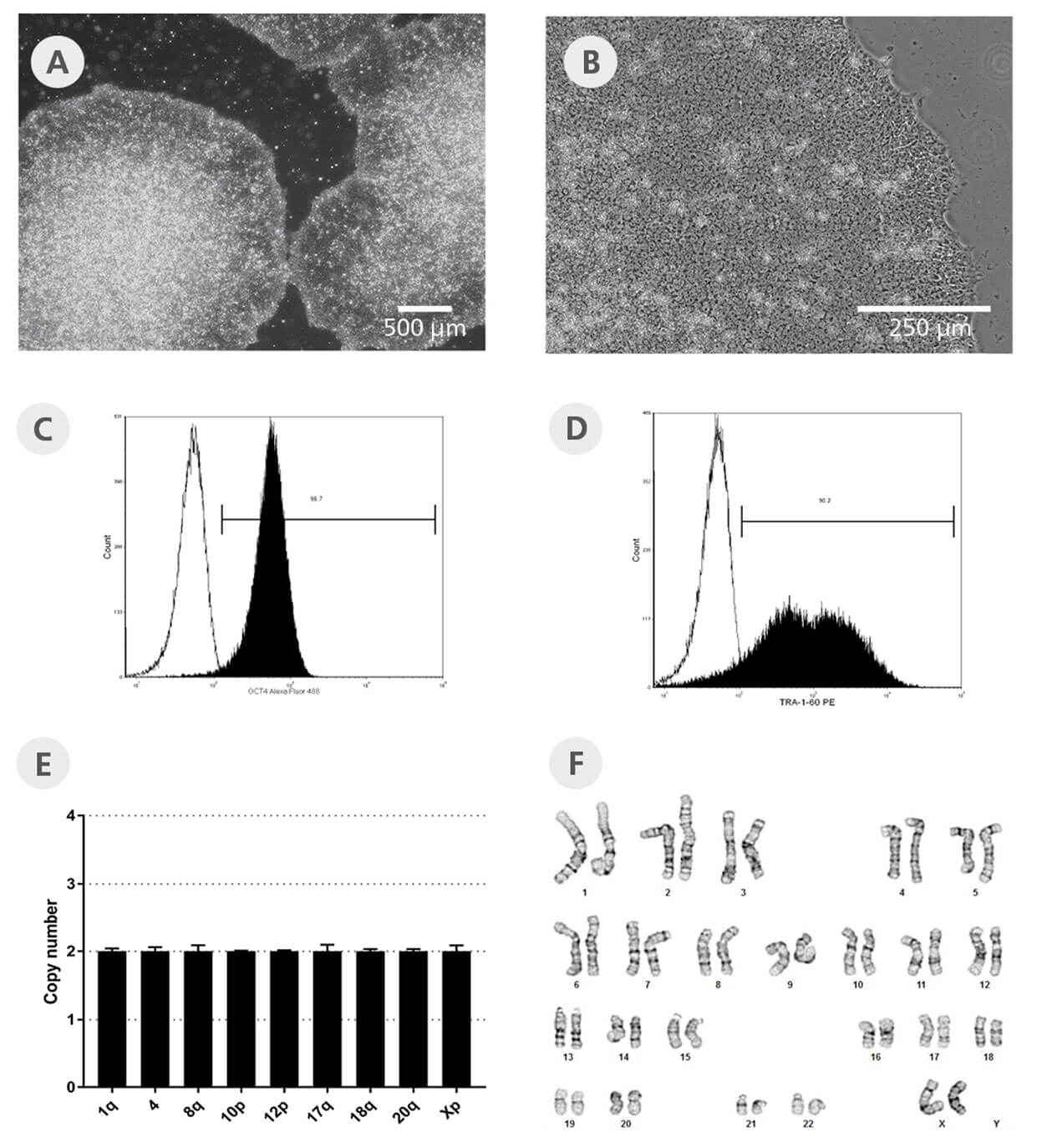 (A-D)在ReproTeSR™中产生的iPS细胞集落,使用mTeSR™1于Corning® Matrigel®的扩增(A-B),细胞表现出经典的ES细胞形态,具有密集的集落中心,明 确的边界,明显的细胞核和高核质比。(C-D)iPS细胞在mTeSR™1培养基中传代9次 后表达高水平的未分化iPSC标志物,如流式分析显示的OCT4和TRA-1-60(实心直 方图=染色样品,实线直方图=未染色样品)。(E)使用hPSC基因检测试剂盒(产品 号 #07550)在第1代传代后分析所获得的结果,全部六种iPS细胞系测试结果全部 显示正常。(F)在传代7结束时进行G-banding karyotype分析。全部两个细胞系通 过G-banding显示出正常核型。相应的细胞系数据如图示。