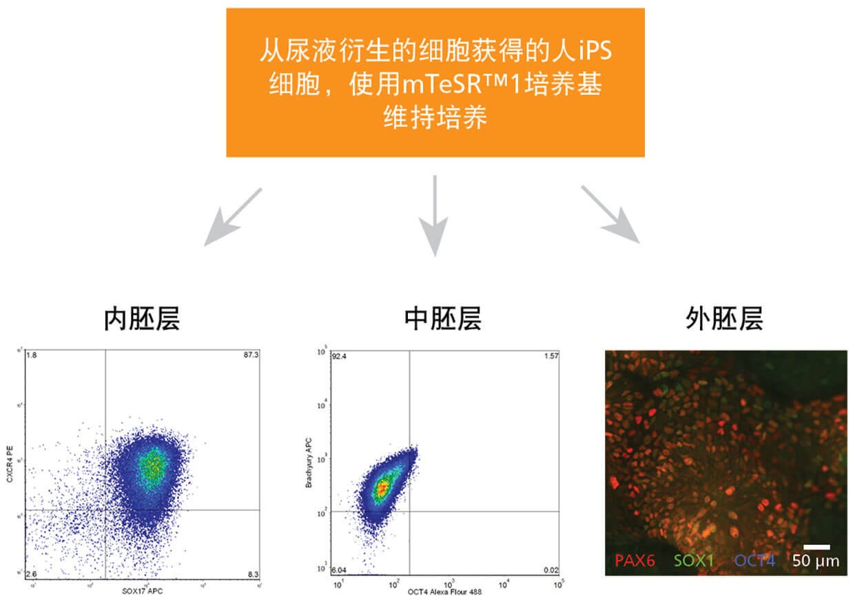 图6. 使用ReproTeSR™重编程的尿液衍生细胞,具有分化为三个胚层 的细胞的能力