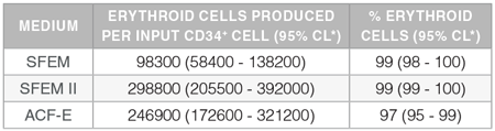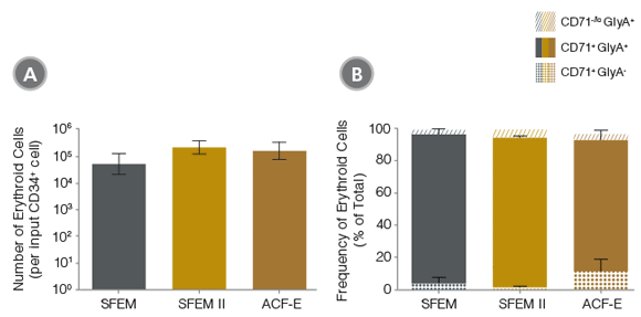 Yields and percentages of erythroid cells produced after culturing purified CD34+ CB cells (n=15) for 14 days in StemSpan™ SFEM, SFEM II or ACF-E media containing Erythroid Expansion Supplement. Erythroid cells were identified by flow cytometry after staining with antibodies against CD71 and GlyA. The % erythroid cells represent the percentage of cells that express CD71 and/or GlyA.